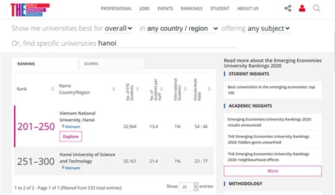 L'Université nationale de Hanoï et l'Université des sciences et des technologies de Hanoï (USTH) ont été classées entre les 201e et 250e places et les 251e et 300e places, respectivement. L'Université nationale de Hô Chi Minh-Ville se positionne dans la fourchette entre la 401e et la 500e place.