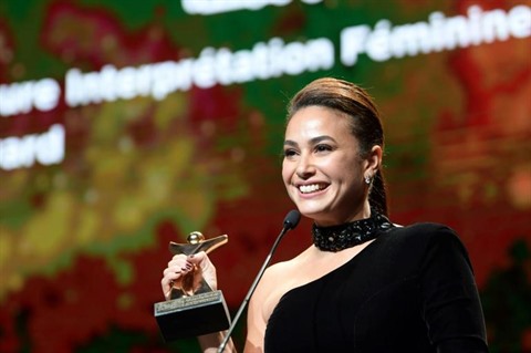 | L'actrice tunisienne Hend Sabri remporte le prix de la meilleure actrice, le 2 novembre à Tunis. |