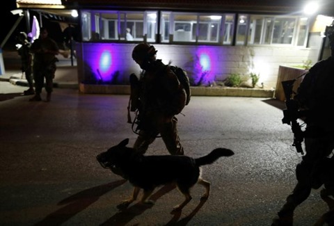 | Des soldats israéliens dans la colonie d'Adam, en Cisjordanie, territoire palestinien occupé par Israël, après une attaque au couteau qui a blessé trois Israéliens, le 26 juillet. |