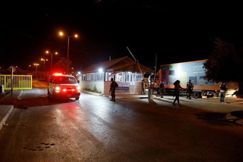 | Des forces israéliennes postées à un barrage au moment du passage d'une ambulance transportant les blessés israéliens d'une attaque au couteau dans une colonie de Cisjordanie occupée près de Ramallah, le 26 juillet. |
