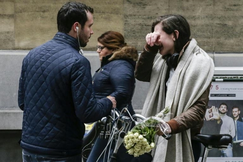 | Une femme en pleurs à l'entrée de la station de métro de Maalbeek le 23 mars à Bruxelles. |