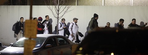 | Un officier de police escorte des travailleurs de l'hôpital Mercy devant l'entrée principale après qu'un homme armé ait tiré sur plusieurs personnes le 19 novembre à Chicago, dans l'Illinois. |
