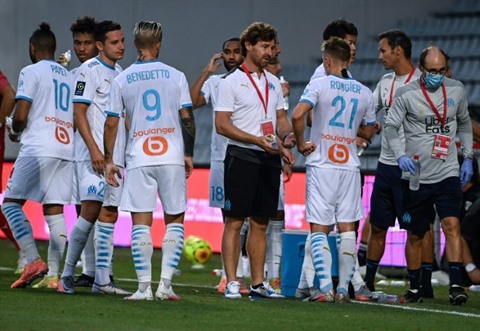 | Les joueurs marseillais, regroupés autour du coach André Villas-Boas en amical face à Nimes au stade des Costières, le 9 août, déplorent quelques cas de COVID-19. |