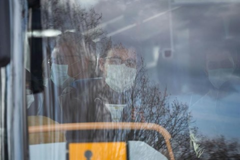| Des passagers portant des masques de protection quittent la base militaire d'Istres, le 9 février. |