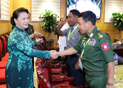 | La présidente de l'Assemblée nationale, Nguyên Thi Kim Ngân (gauche), et des délégués présents au troisième échange "Frontière d'amitié" à Hanoï. |
