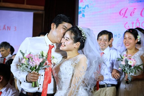 | Un couple lors d'un mariage collectif, le 6 démanche à Hanoï. |