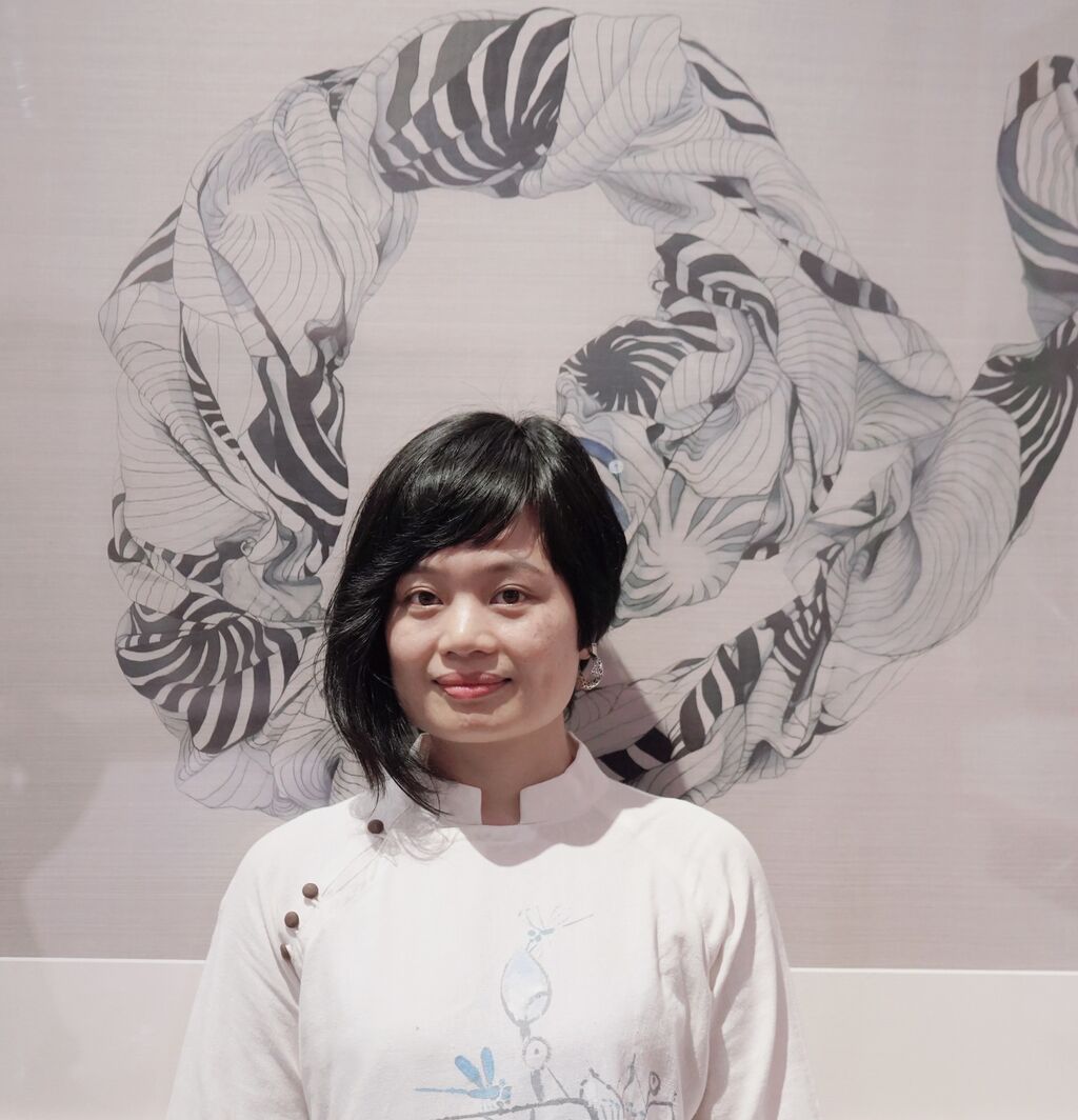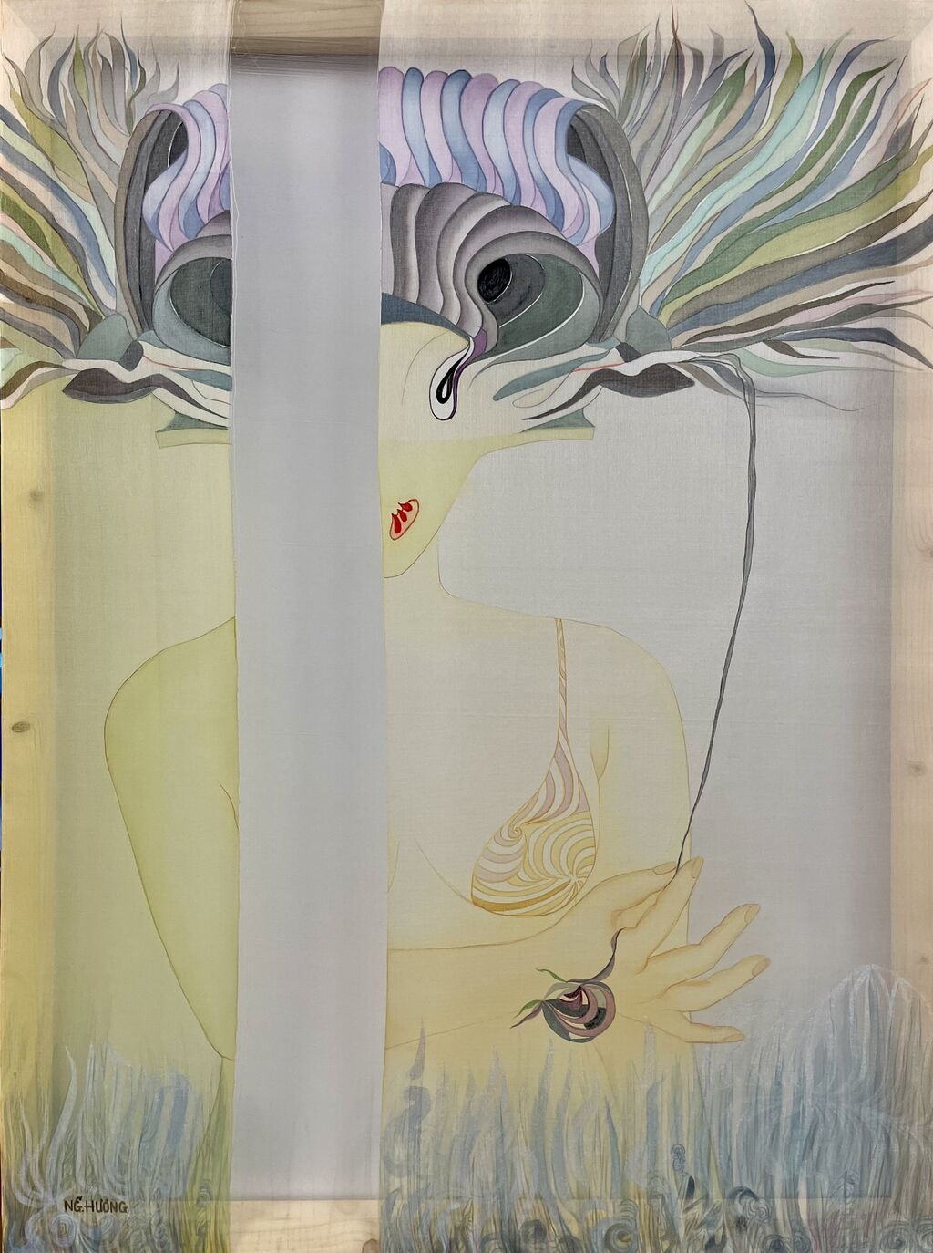 L'exposition, intitulée "Huong", marque les dix ans de l’utilisation de la soie pour les toiles de Nguyên Thu Huong, une peintre qui a commencé avec cette matière en 2012. L'artiste utilise toujours de la soie tissée à la main du village de Quan Phô, Duy Tiên, province de Hà Nam.