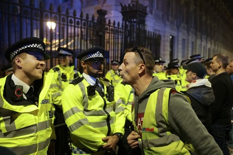 | Des partisans du Pro-Brexit affrontent la police devant Downing Street à Londres, le 29 mars 2019. |
