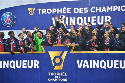 | Les joueurs du Paris Saint-Germain, vainqueurs du Trophée des Champions face à Marseille (2-1), le 13 janvier à Lens. |