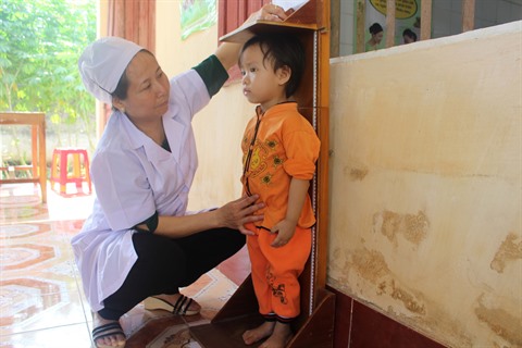 | Une infirmière dans la commune de Yên Thinh, province de Thanh Hoa (Centre), mesure la hauteur et le poids d’une enfant. |