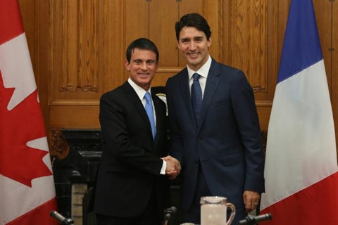 | Les Premiers ministres français Manuel Valls (gauche) et canadien Justin Trudeau, le 13 octobre à Ottawa. |