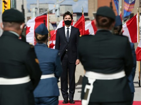 | Le Premier ministre canadien Justin Trudeau lors de l'hymne national avant le "discours du trône", le 23 septembre. |