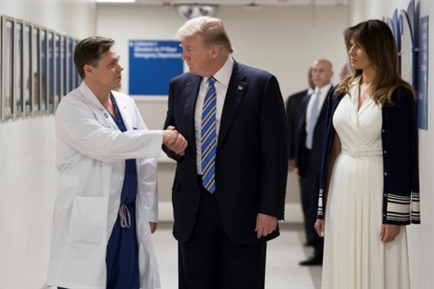 | Donald et Melania Trump remercient le 16 février 2018 le personnel d'un hôpital de Floride où ont été soignés des victimes de la tuerie de Parkland. |