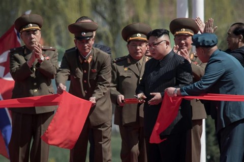 | Le leader nord-coréen Kim Jong-Un (2e à droite) inaugure un complexe résidentiel, le 13 avril à Pyongyang. |
