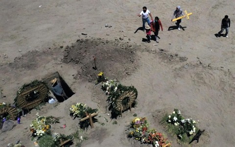 | Funérailles d'une personne décédée du coronavirus au cimetière de Valle de Chalco, le 4 juin 2020 au Mexique. |