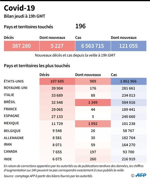 À l'échelle mondiale, la pandémie a fait plus de 392.000 morts depuis que le virus est apparu fin décembre en Chine. Les États-Unis restent de loin le pays le plus touché (plus de 108.000 décès), suivis par le Royaume-Uni (40.261), le Brésil (34.021), l'Italie (33.774) et la France (29.111).