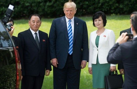 | Donald Trump et Kim Yong Chol posent devant la Maison-Blanche, le 1er juin. |