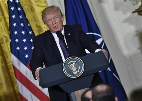 | Le président américain Donald Trump lors d'une conférence de presse conjointe avec le secrétaire général de l'OTAN Jens Stoltenberg à la Maison-Blanche, le 12 avril. |