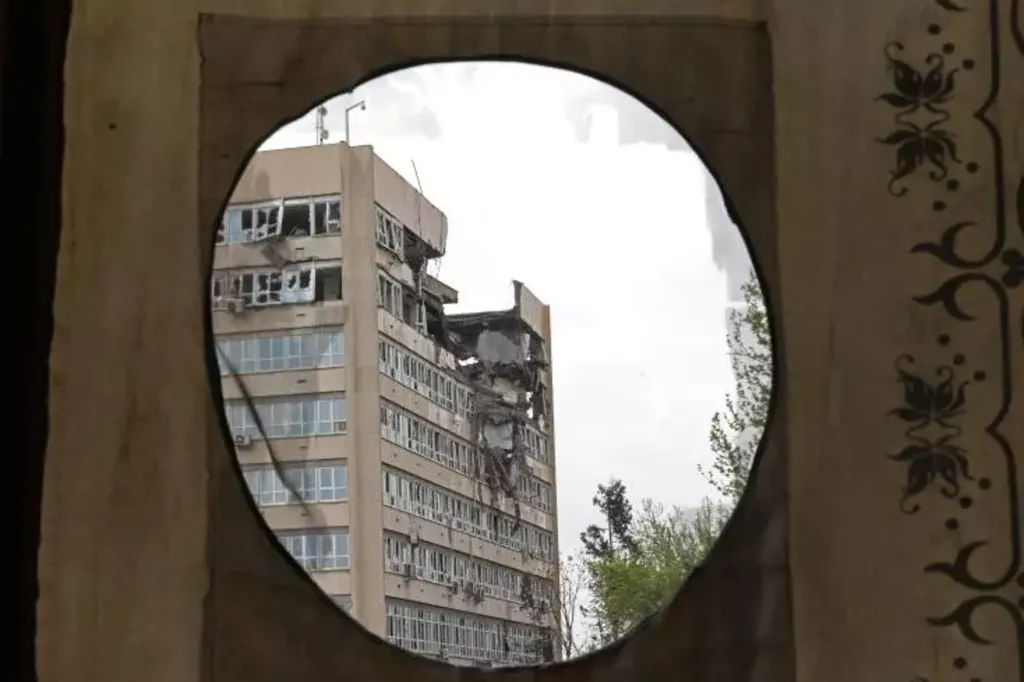 | Un bâtiment endommagé par de récentes frappes est visible à travers un rideau installé sur une partie extérieure du palais historique du Golestan, à Téhéran, le 4 avril 2026. |