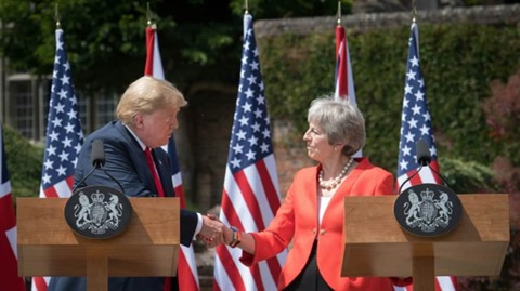 | Le président américain Donald Trump et la Première ministre britannique Theresa May se serrent la main à l'issue d'une conférence de presse, le 13 juillet à Chequers. Photo: AFP/VNA/CVN |