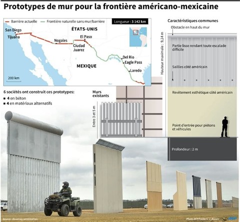 | Caractéristiques des prototypes du mur que souhaite construire le président américain Donald Trump sur la frontière avec le Mexique. |