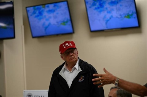 | Le président Donald Trump le 29 août au cours d'une visite à Orange (Texas) après le passage de l'ouragan Laura qui a frappé la Louisiane et le Texas. |