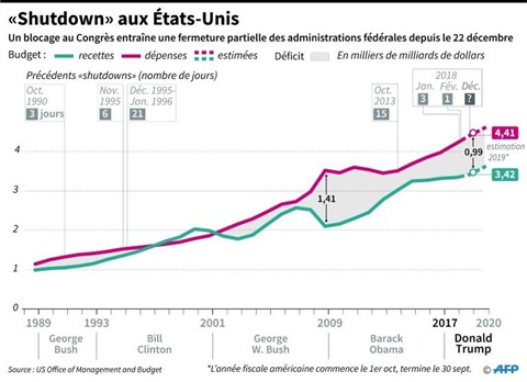 Chronologie des précédentes fermetures partielles des administrations fédérales aux États-Unis ("shutdowns") avec évolution du solde budgétaire, depuis 1989. Photo: AFP/VNA/CVN |
