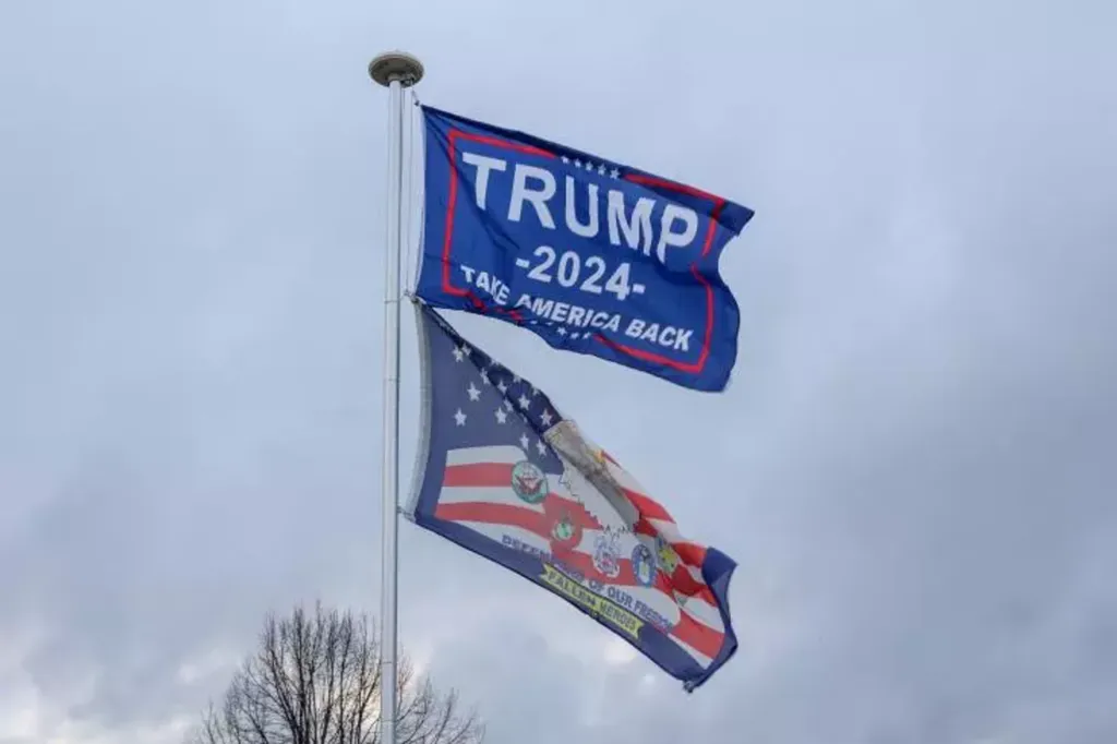 | Des drapeaux de soutien à Donald Trump à Horicon (Wisconsin), le 4 novembre 2024. |