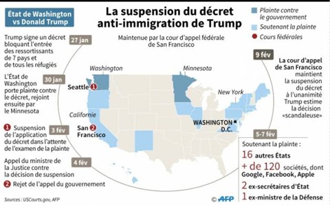 Instauré à la surprise générale le 27 janvier, son décret de fermeture partielle des frontières a subi en deux semaines deux coups d'arrêt dans l'Ouest des États-Unis : le 3 février, un juge de Seattle en a bloqué l'application. Jeudi 9 février, la cour d'appel de San Francisco a maintenu cette suspension.