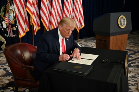 | Le président américain Donald Trump signe un plan d'aide à l'économie par décret au cours d'une conférence de presse dans son club de golf de Bedminster, dans le New Jersey, le 8 août. Photo : AFP/VNA/CVN |