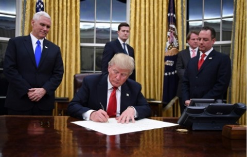 Après sa prestation de serment et son discours au Capitole en milieu de journée, il a assisté au défilé traditionnel suivant l'investiture des présidents américains, puis a rapidement signé son premier décret en début de soirée, dans le Bureau ovale.
