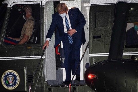 | Le président américain Donald Trump descend de l'hélicoptère Marone One à son arrivée à la Maison Blanche, le 5 octobre à Washington. |