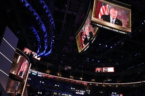 | Donald Trump sur un écran géant lors de la convention du Parti républicain le 19 juille |