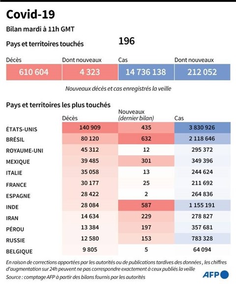 L'épidémie, qui a fait selon le dernier décompte de l'AFP au moins 610.604 morts et contaminé plus de 14.736.130 personnes dans le monde, continue de progresser.