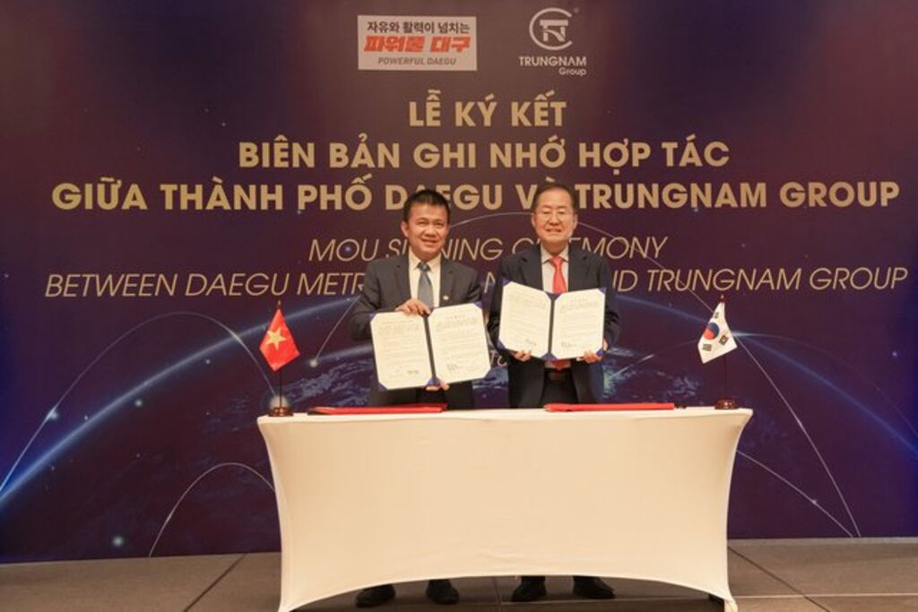 | Des représentants du groupe Trung Nam (Trung Nam Group) et de la ville sud-coréenne de Daegu signent un mémorandum de coopération. |