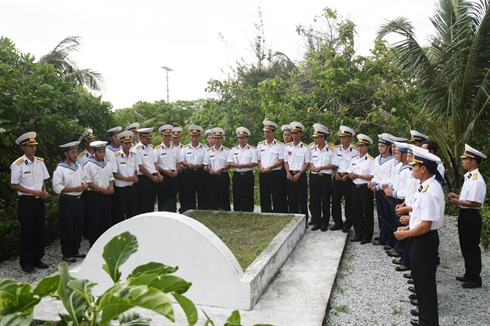 | Des marins ayant terminé leur mission brûlent des bâtonnets d’encens à la mémoire de leurs camarades qui se sont sacrifiés pour la Patrie sur l’île de Nam Yêt, avant de regagner la terre ferme. Photo : VNA/CVN |