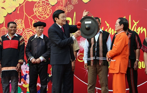 | Truong Tân Sang (3e gauche) à la fête ‘’Les couleurs du printemps dans tout le pays’’, le 18 février au Village culturel et touristique des ethnies du Vietnam. |