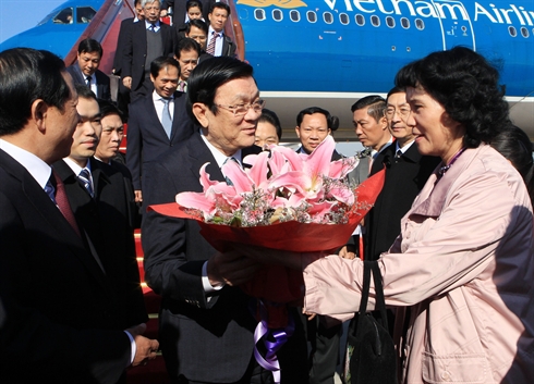 | Le président de la République, Truong Tân Sang, est accueilli à l'aéroport par la communauté des Vietnamiens en Chine. |
