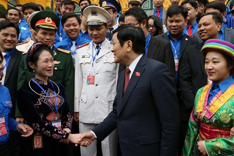| Le président Truong Tân Sang (premier plan, 2e à droite) rencontre le 25 mars à Hanoi des membres exemplaires de l'Union de la jeunesse communiste Hô Chi Minh. |