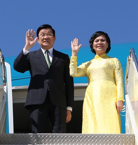 Le président vietnamien et son épouse sont accompagnés, entre autres, du vice-Premier ministre et ministre des Affaires étrangères Pham Binh Minh, du président de la Commission économique du Comité central du Parti communiste du Vietnam Vuong Dinh Huê, du ministre de l’Industrie et du Commerce, Vu Huy Hoàng, du ministre des Sciences et des Technologies, Nguyên Quân, et du ministre du Transport et des Communications, Dinh La Thang.