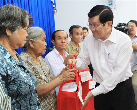 | Le président Truong Tân Sang (droite) offre des cadeaux aux foyers pauvres de la commune frontalière d'An Nông du district de Tinh Biên, province d'An Giang. |