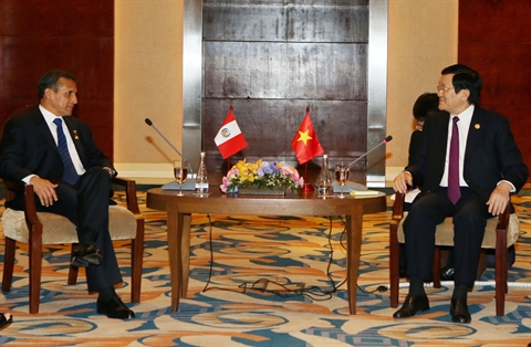 Lors de la rencontre avec le président péruvien Ollanta Humala, Truong Tân Sang a demandé à deux parties d’opérer bientôt le Comité intergouvernemental des affaires économiques et de la coopération technique, de négocier l’accord-cadre sur le commerce et l’investissement. Les deux dirigeants ont convenu de partager leurs expériences pour appliquer des engagements de l’Accord de partenariat trans-pacifique (TPP) dès son entrée en vigueur. Ils ont affirmé leur soutien et leur coordination dans l’organisation des Sommets de l’APEC en 2016 lorsque le Pérou sera le pays hôte, et en 2017, quand ce sera le tour du Vietnam.