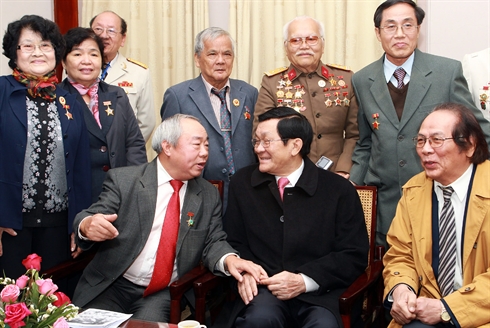 | Truong Tân Sang (1er plan, centre) lors d'une rencontre traditionnelle avec des anciens enfants de troupe du Vietnam, à l'occasion du Nouvel An |