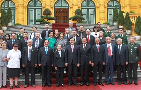 | Le chef de l'État vietnamien Truong Tân Sang (1er rang, centre) avec la délégation de proches d’anciens conseillers militaires chinois, le 23 avril à Hanoi. |