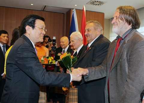 | Le président Truong Tân Sang (gauche) rencontre des professeurs et experts tchèques actifs dans la lutte pour l'indépendance nationale du Vietnam |
