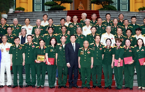 | Le président de la République, Truong Tân Sang (1er plan, centre), entouré d'anciens combattants de Truong Son. |