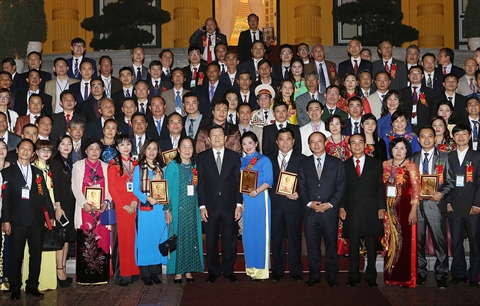 | Le président du Vietnam, Truong Tân Sang (1er plan, centre), et des représentants des PME, le 12 janvier à Hanoi. |