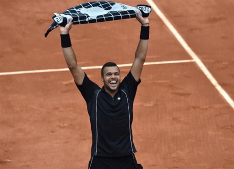 | La joie de Jo-Wilfried Tsonga, vainqueur de Tomas Berdych et qualifié pour les quarts de finale de Roland-Garros, le 31 mai. |