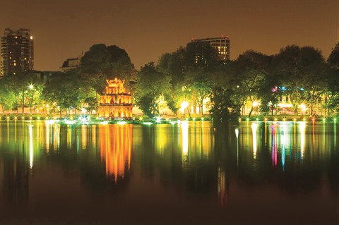 | Le lac Hoàn Kiêm (lac de l’Épée restituée) en soirée, avec la Tour de la Tortue au centre.