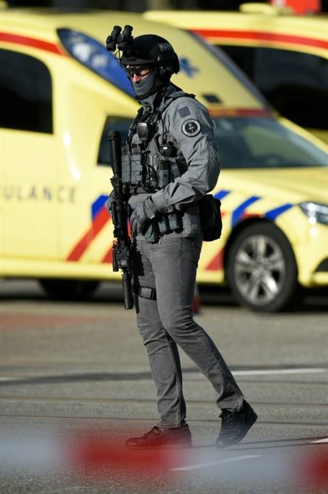 | Un membre des forces spéciales de la police néerlandaise patrouille le 18 mars près du site de la fusillade qui a fait trois morts. |